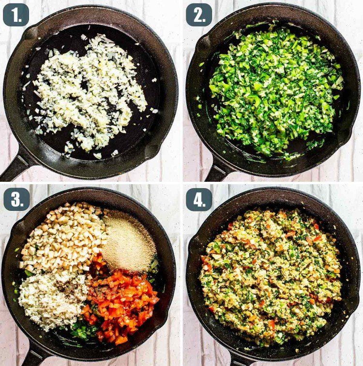 Verhit de olijfolie in een koekenpan op middelhoog vuur. Voeg de gesnipperde ui en knoflook toe en sauteer een paar minuten tot de ui doorschijnend is. Voeg de groene peper en de spinazie toe en bak nog een paar minuten, tot de spinazie zacht wordt. Roer de tomaten, geitenkaas, zout, peper, champignonstelen, hete saus en paneermeel erdoor. Kook nog 2 minuten.