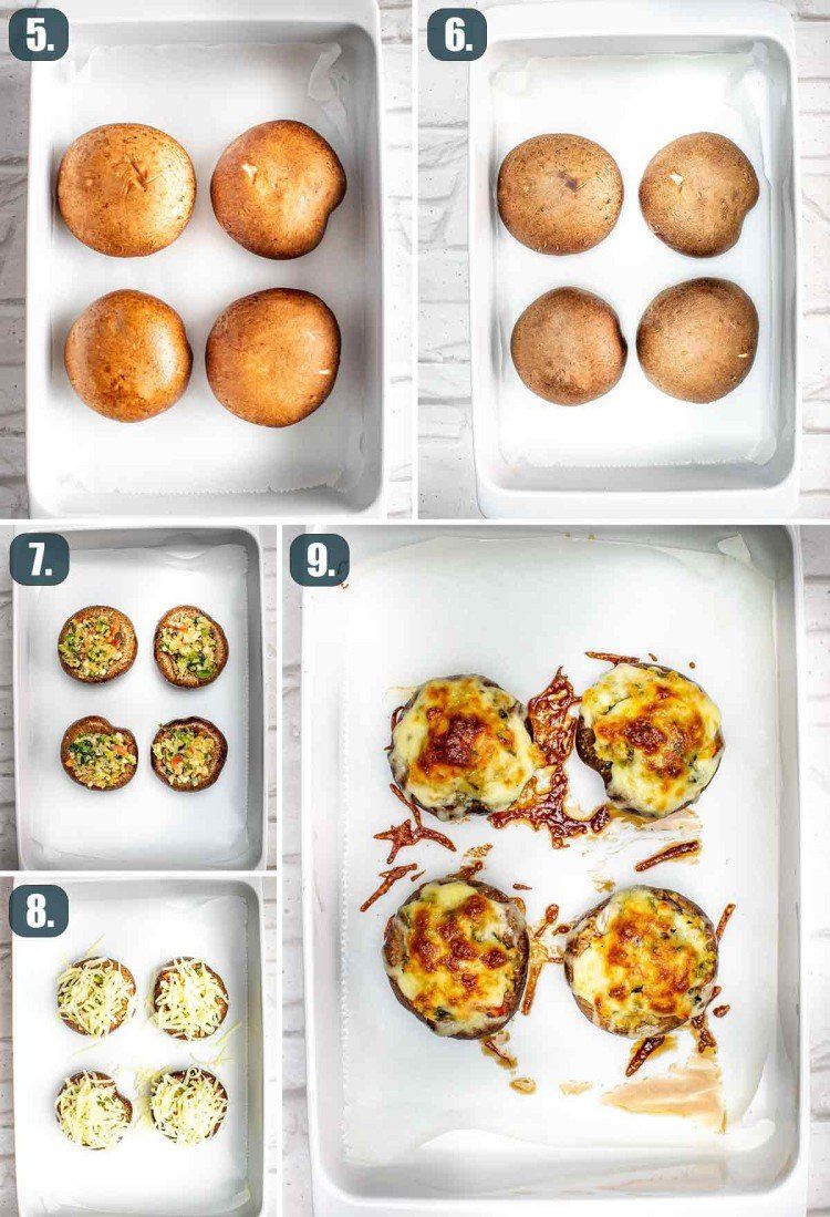 STAP EEN: Voorbereiding. Verwarm de oven voor op 200°C. Verwijder voorzichtig de stelen van de champignons, bewaar ze en hak ze fijn voor de vulling. Leg de champignons met de steel naar beneden op een bakplaat. Bak 10 tot 15 minuten tot het water eruit lekt. Haal ze uit de oven en gebruik keukenpapier om het overtollige water op te zuigen. Zet opzij.